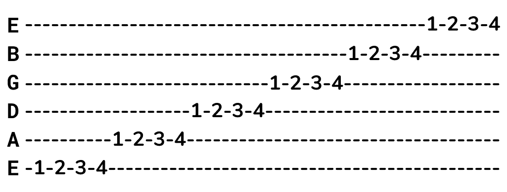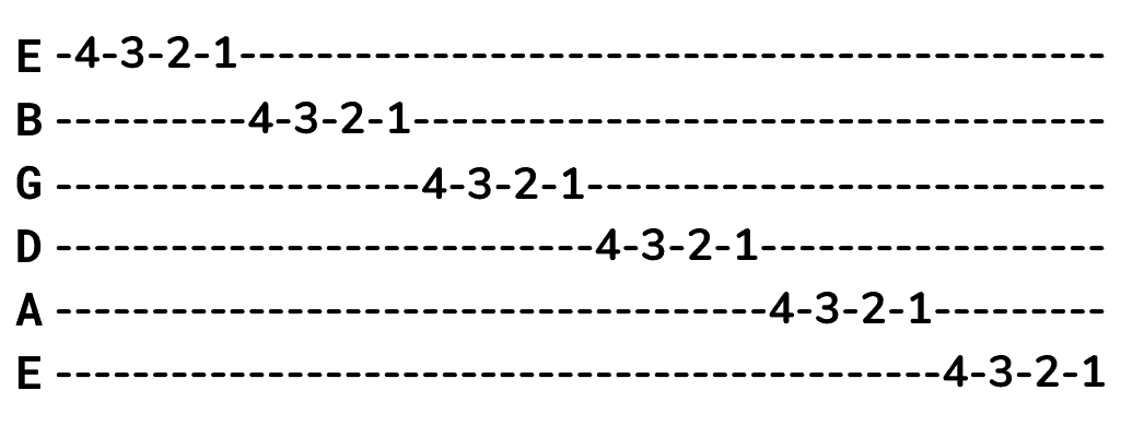 Once you reach the fourth fret on the high E string, you can reverse the order. Play the frets four through one, starting with the high E string and make your way down to the low E string.