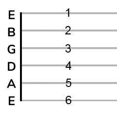 If you were to place a guitar on your lap and look at the fretboard, you would count the strings from top to bottom. This is also how guitar tab is written.
