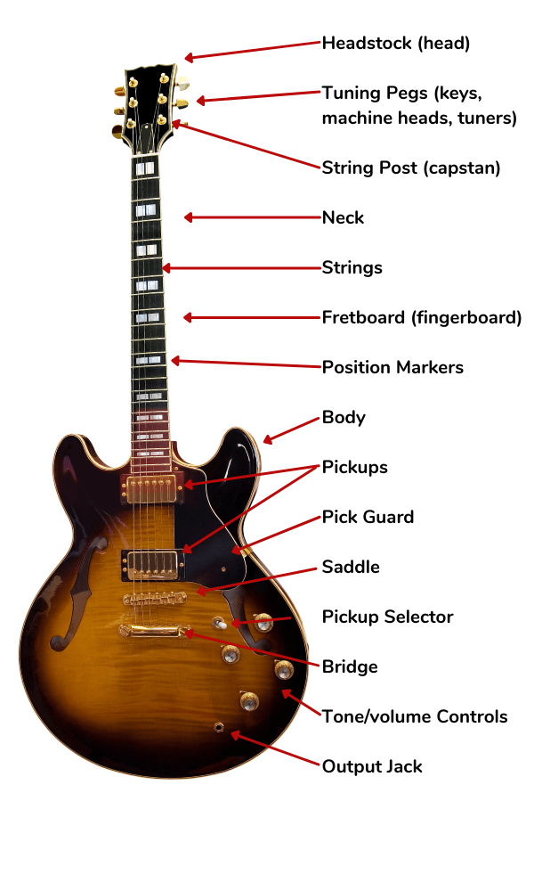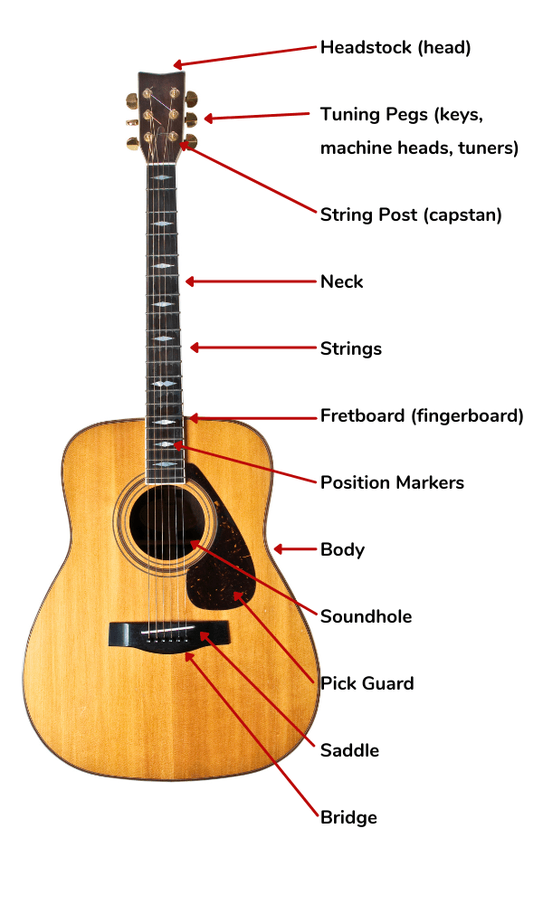 Well, yes, that’s true in the most basic sense. But each of those components is made up of a number of parts that all come together to create what we know as a guitar. What are the parts of a guitar, and what are their functions? We include ‘parts of a guitar’ diagrams for both electric and acoustic guitars. This information will surely come in handy for you on your journey to rock stardom!