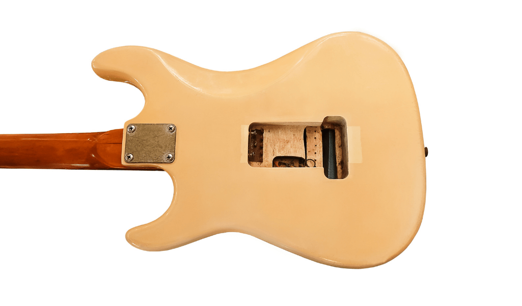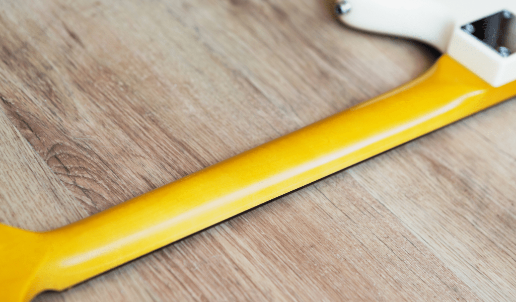 Some guitar neck backs include a heel that connects the neck to the body of the guitar. Other guitars use a bolt-on system, and still, others have a neck-thru-body style of build, where the neck and the body are made from the same piece of wood.