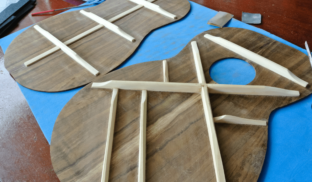 Acoustic guitars have bracings inside the body of the guitar. Bracing is a series of wood pieces that reinforce the body and help shape the sound of the guitar. Common bracing styles include ladder bracing and cross bracing.
