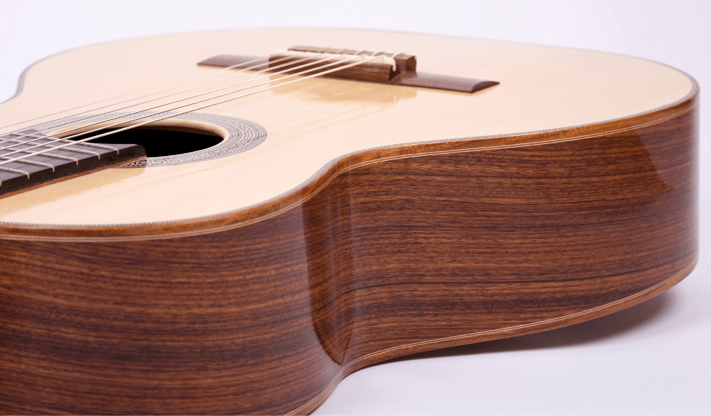 Sometimes known as the soundboard, the guitar top is the front-facing side of the guitar. It is where the strings are struck, and it holds most of the sound-making components of the guitar. Guitar tops can be flat or what is known as an arch-top.